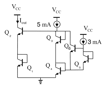 در شکل زیر همه ترانزیستورها مشابه با I S یکسان و بتا خیلی بزرگ مفروضند. جریان I out چند میلی آمپر است؟