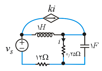 در شکل زیر مقدار k جقدر باشد تا مدار میرای بحرانی گردد؟ در این حالت فرکانس طبیعی مدار را به دست آورید.