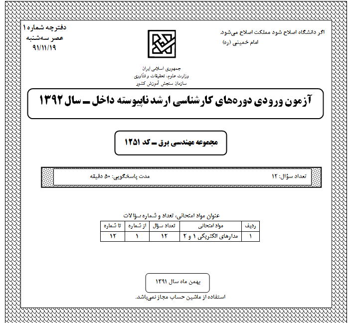 آزمونهای دوازده گانه مدارهای الکتریکی تا کنکور 1392
