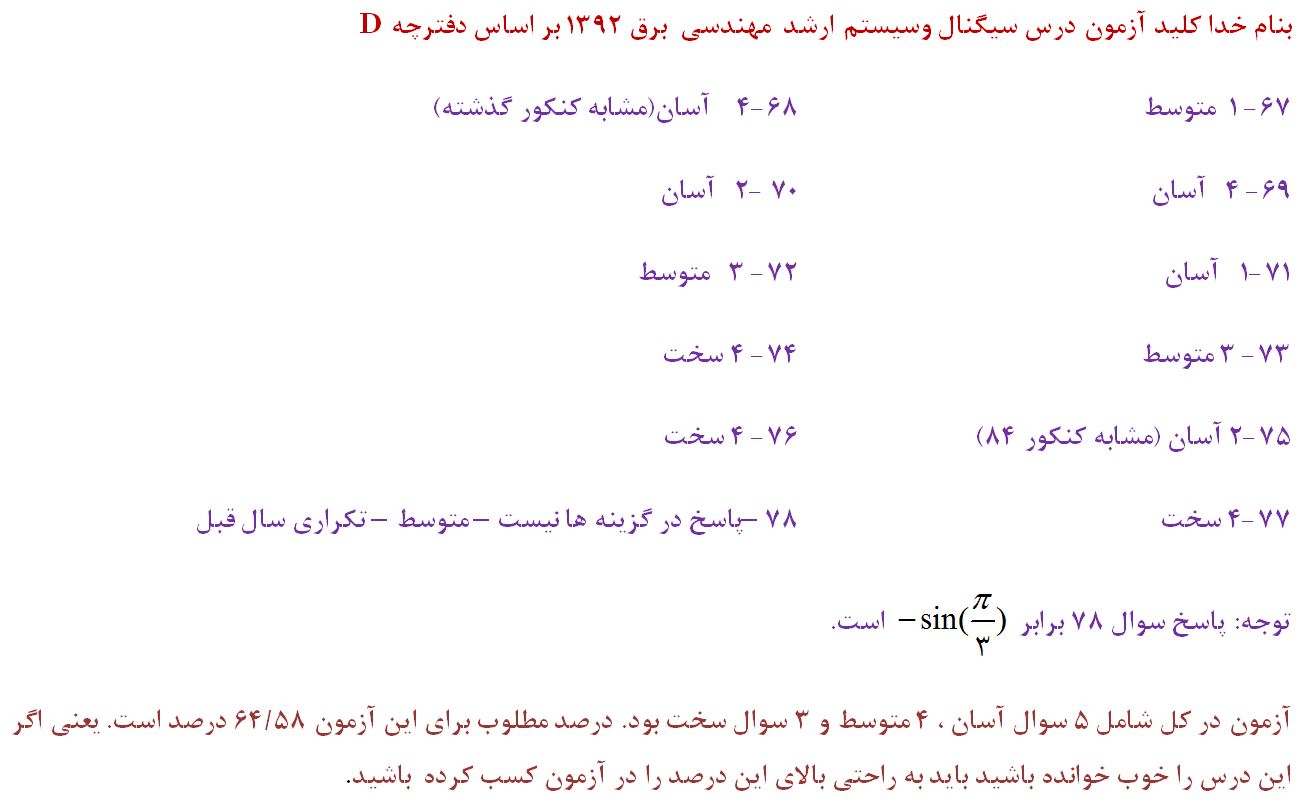 کلید اولیه آزمون سیگنال و سیستم سال 1392