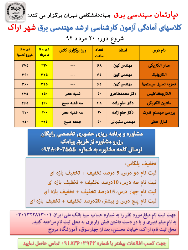 کلاسهای آمادگی ازمون کارشناسی ارشد مهندسی برق شهر اراک تابستان 92